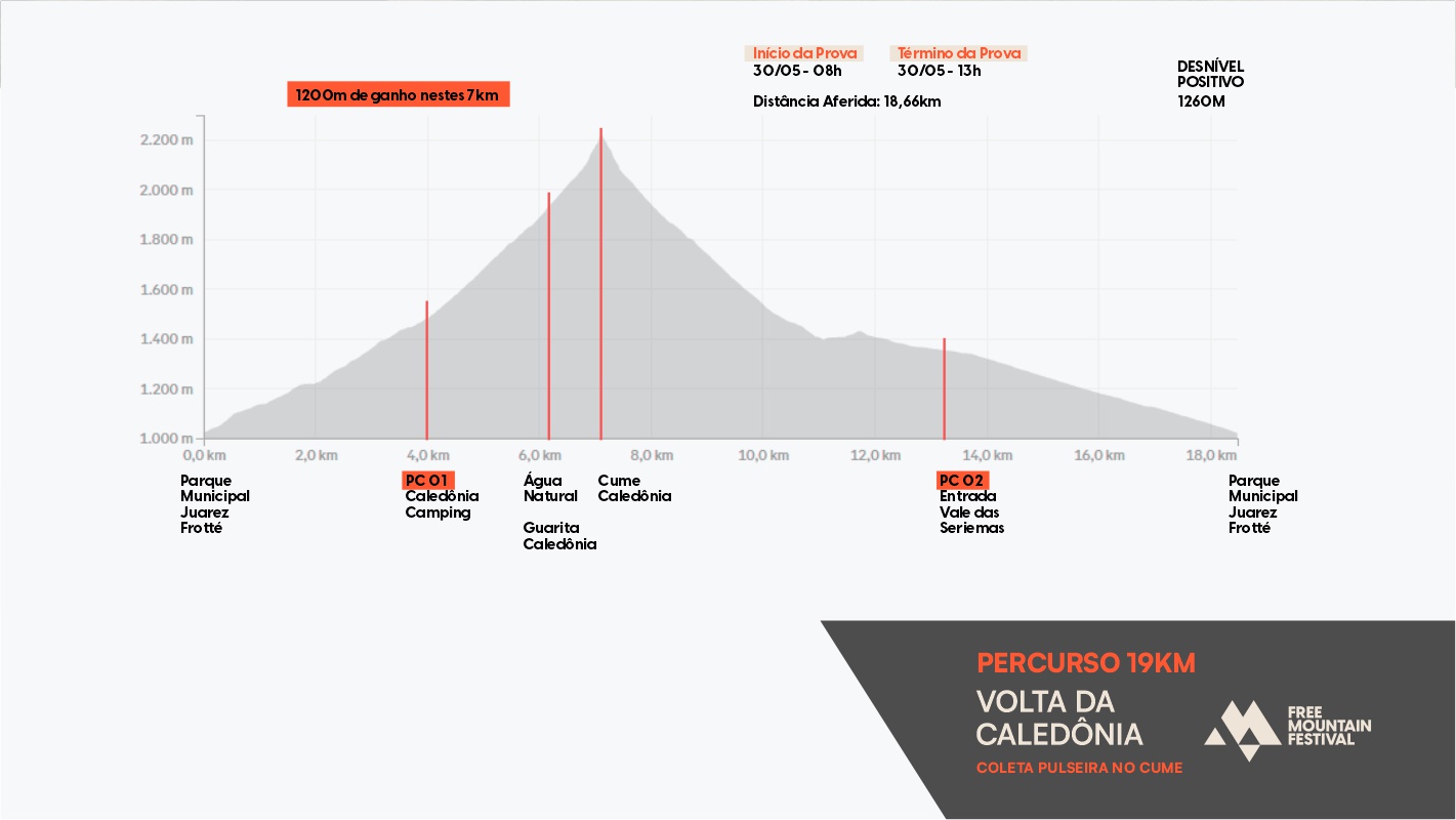Os dois percursos da prova se iniciam no Parque Municipal Juarez Frotté e segue o caminho tradicional de calçamento que dá acesso ao Pico da Caledônia, este início é extremamente desafiador e apresenta uma subida bem longa de 7km até o cume do Pico da Caledônia, entenda que é NORMAL CAMINHAR neste trecho e você pode fazer um TREKKING FORTE sem que tenha muita diferença no seu tempo final de prova.
